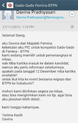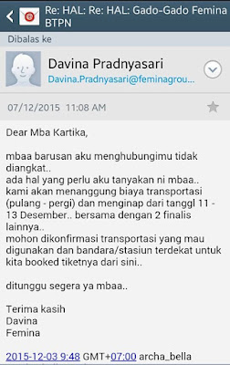 Eh, dasar aku orangnya ga mudah percayaan. Jangan-jangan ini email hoax, orang ga jelas yang ngaku2 dari Femina. Akhirnya kubalas emailnya dengan nomer teleponku, dan ga ada 10 menit, mbak Davina konfirmasi ke aku kalo aku menjadi salah satu finalis GADO-GADO FEMINA.
