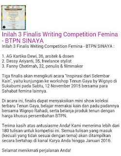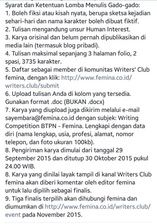 Awalnya gara-gara ada share lomba penulisan GADO-GADO FEMINA sekitar bulan Oktober th 2015 lalu yang diposting oleh Mbak Dewi Rieka, empunya cerita ANAK KOST DODOL yang ngehitz banget dan sudah difillmkan itu, bahwa Majalah Femina bekerja sama dengan BTPN Sinaya mengadakan sayembara penulisan Gado-Gado.
