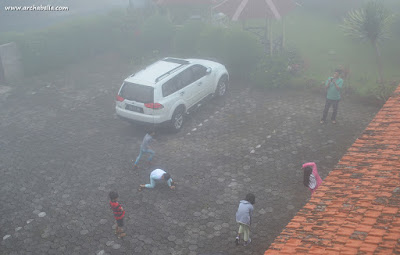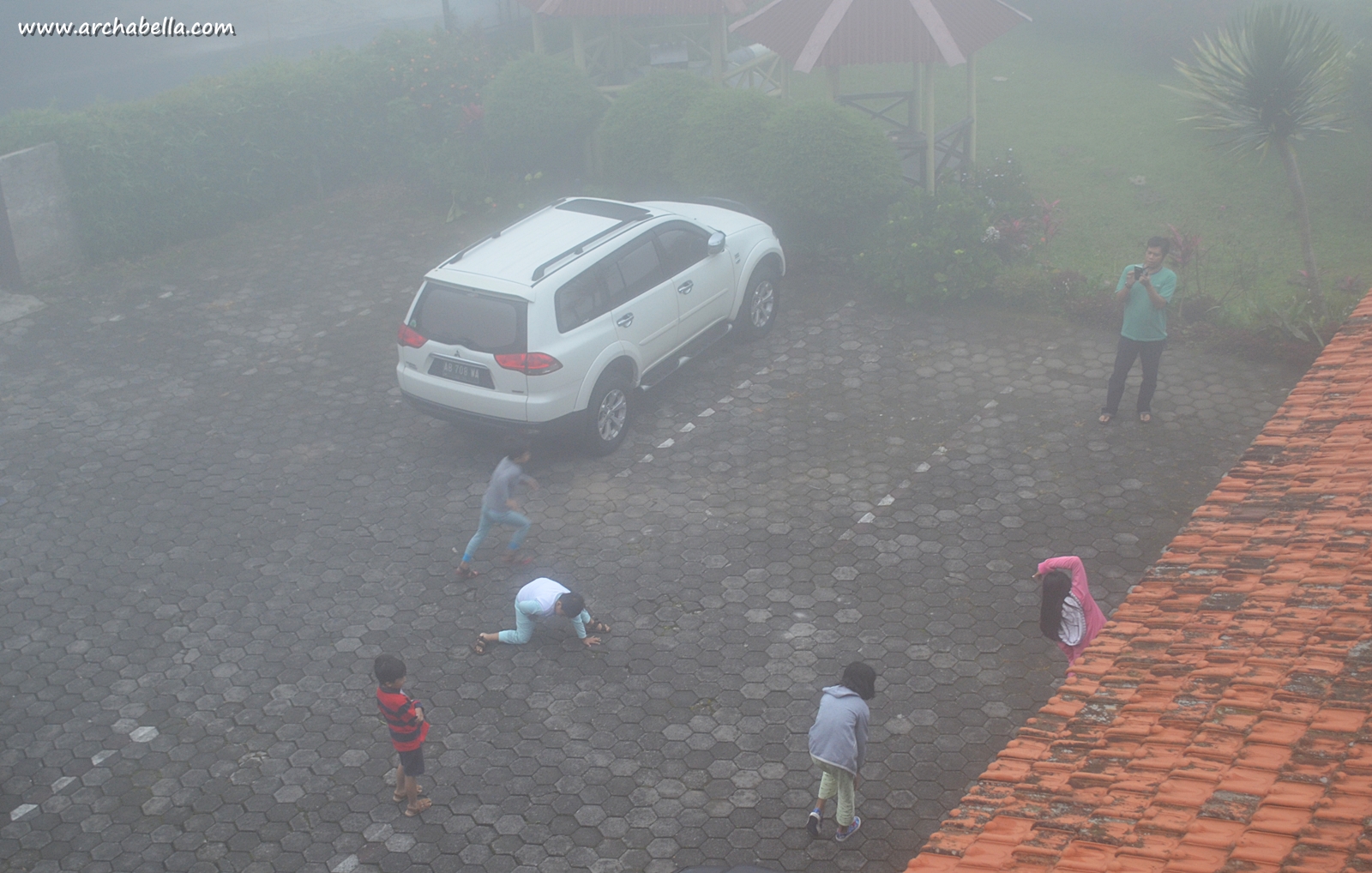 | Enrico ( memakai sweater abu2) ceria bermain dengan saudara2nya saat kabut pegunungan sedang turun dan dingin |